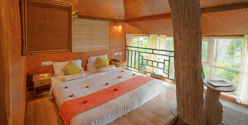 Our luxurious wooden twin cottages are 400 sq. feet each featuring designer wooden furniture. All cottages are with attached bathrooms and open to sky shower area; both having RO purified hot and cold water facilities.