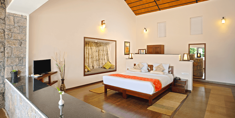 Our wooden premium villas are 400 sq ft each and adorned with traditional wooden furniture. All cottages have attached bathrooms and open to sky shower area; both having purified hot and cold water facilities.