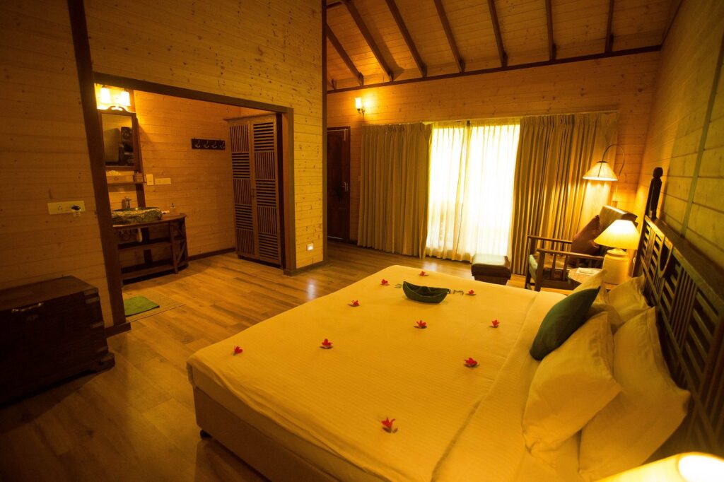 The spacious luxury suite rooms are 850 sq ft each and come with a spacious bedroom, en suite bathroom with a shower, jetted bathtub and a beautiful open balcony that looks out to the breathtaking views of Munnar.