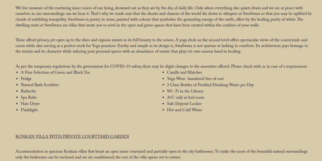 SwaSwara, Gokarna is a tranquil wellness retreat nestled between the serene Om Beach and lush tropical forests, designed for deep rest and mindful living. Rooted in the philosophy of holistic well-being, SwaSwara blends yoga, Ayurveda, meditation, art, and nature-based therapies to help guests reconnect with themselves at a gentle, unhurried pace. With earthy architecture, open spaces, nourishing vegetarian cuisine, and thoughtfully curated wellness programs, the retreat offers a soulful escape where silence, simplicity, and self-care come together in perfect harmony.